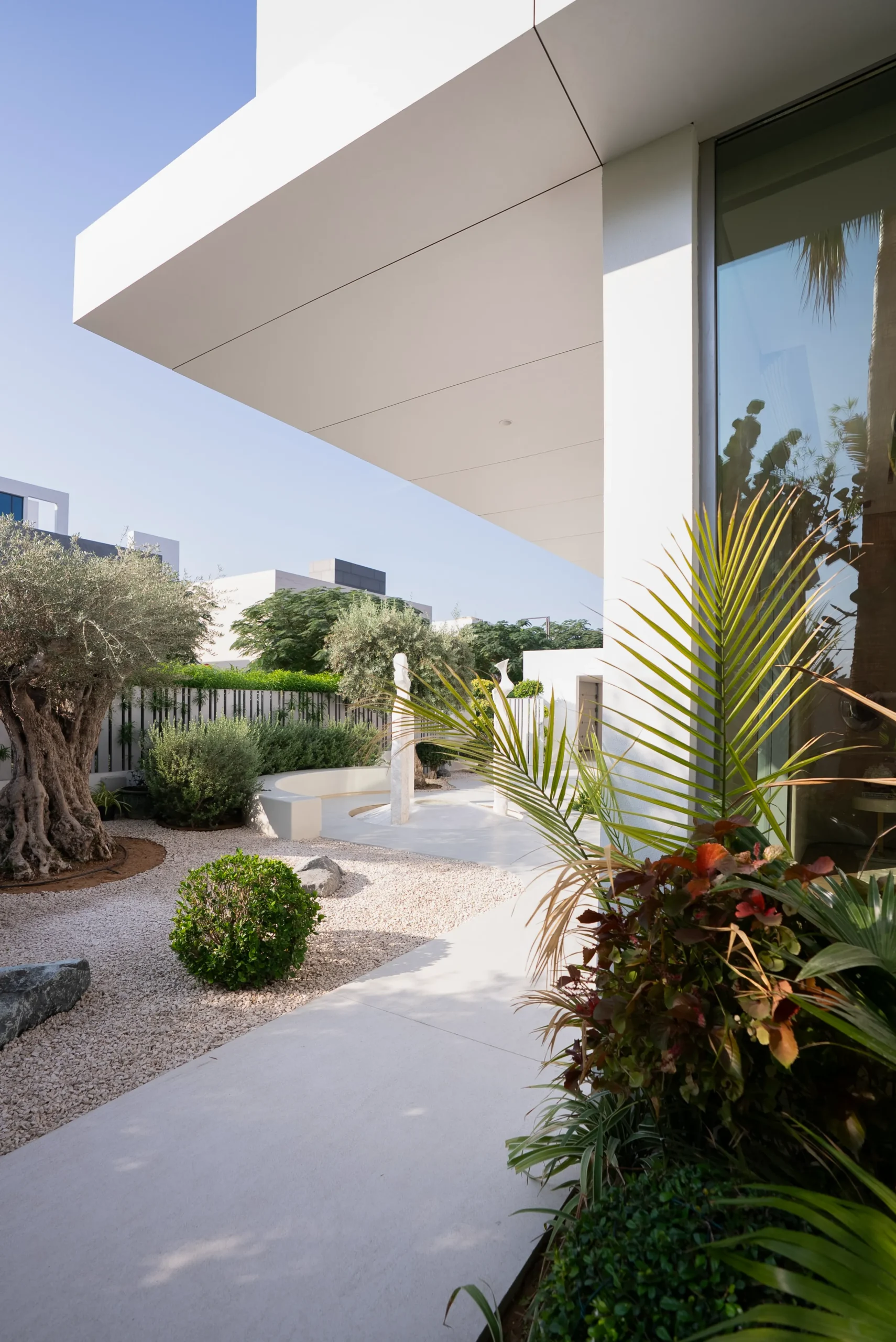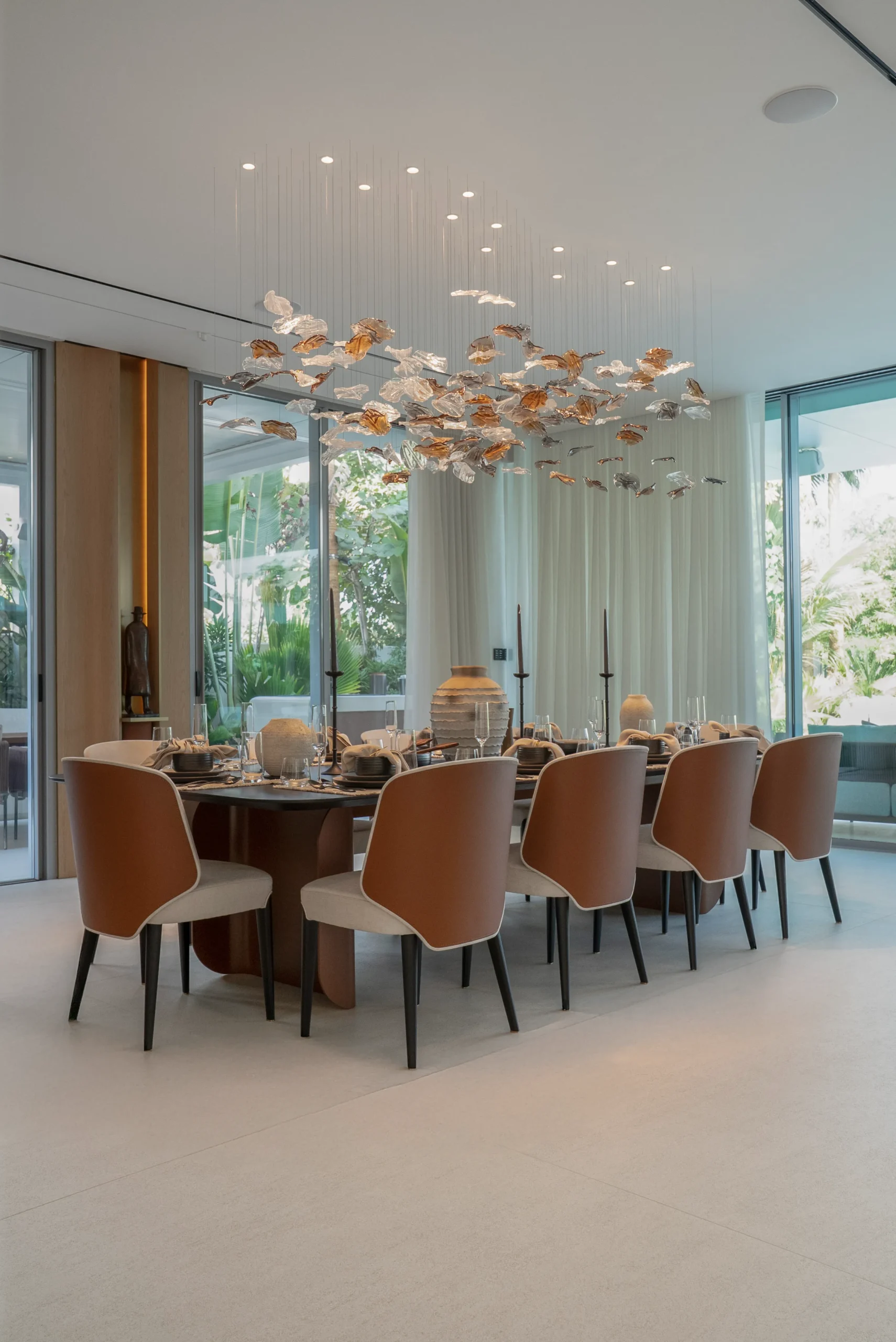 Managing the interplay of natural and artificial lighting to create a harmonious ambiance. Addressing structural constraints to achieve the desired layout and design vision. Coordinating the installation of fixtures and fittings across both interior and exterior spaces. Ensuring privacy and acoustics in indoor areas while maintaining an open and inviting feel in the exterior living spaces. Overcoming logistical challenges related to the integration of landscaping with the architectural design.